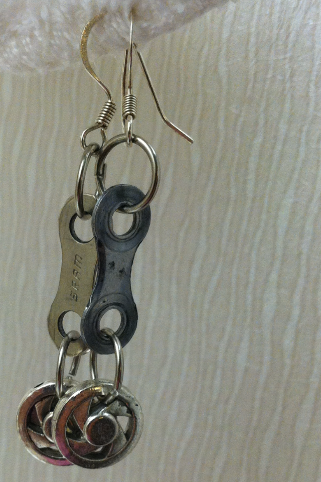 Well, I received a very special new pair from Pedal Chic in Greenville, SC. These earrings are noteworthy not only because they are beautiful but also because they were hand-crafted by Ron, the shop’s mechanic. It turns out that the unassuming man who tuned up my bike and replaced the chain is also capable of artfully designing bike-related jewelry!