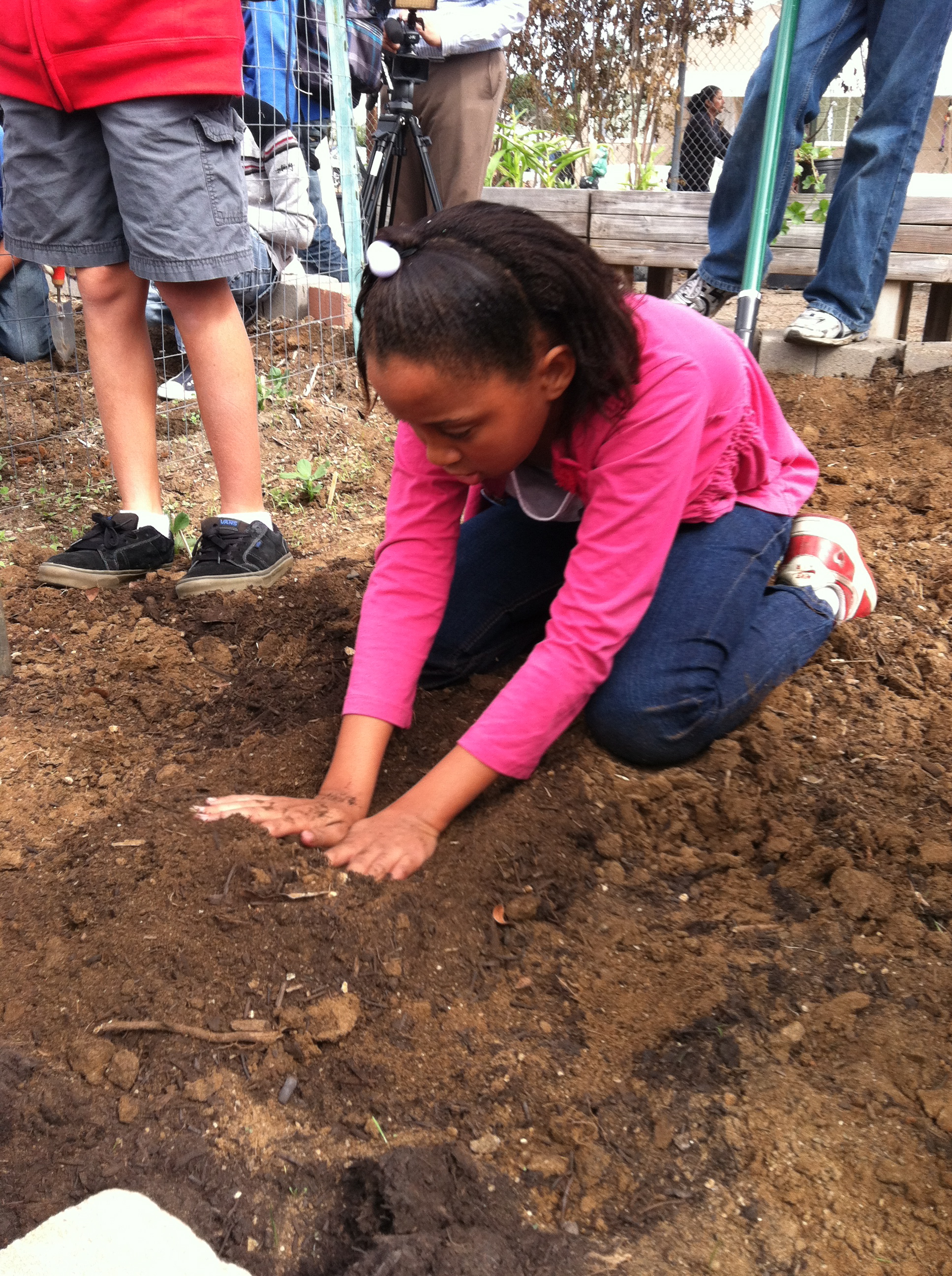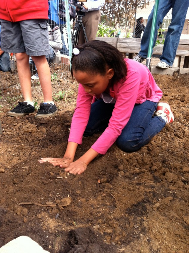 Next we were off to Montgomery Middle School where a smoothie bike demo was set up in the cafeteria. After a quick class presentation the students sampled smoothies, ate a quick salad and then headed out to the garden for some planting. Farmer Dave brought along some plants and the students set to work preparing beds, digging, and searching for grub worms.
