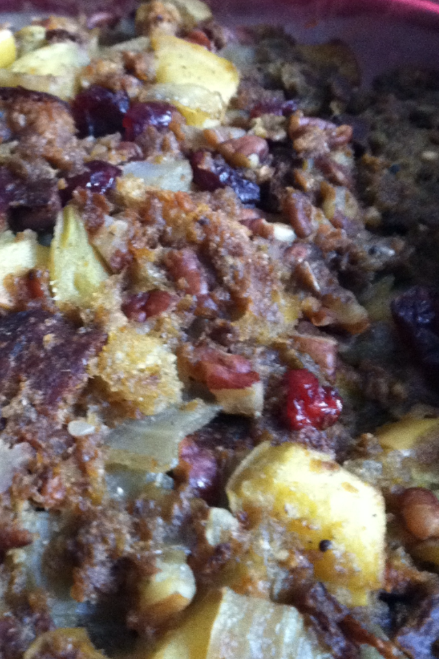This was an experiment that I threw together at the last minute to try my hand at a vegetarian stuffing. It turned out quite well. You can add other dried fruits, I just used what was in the cupboard.
