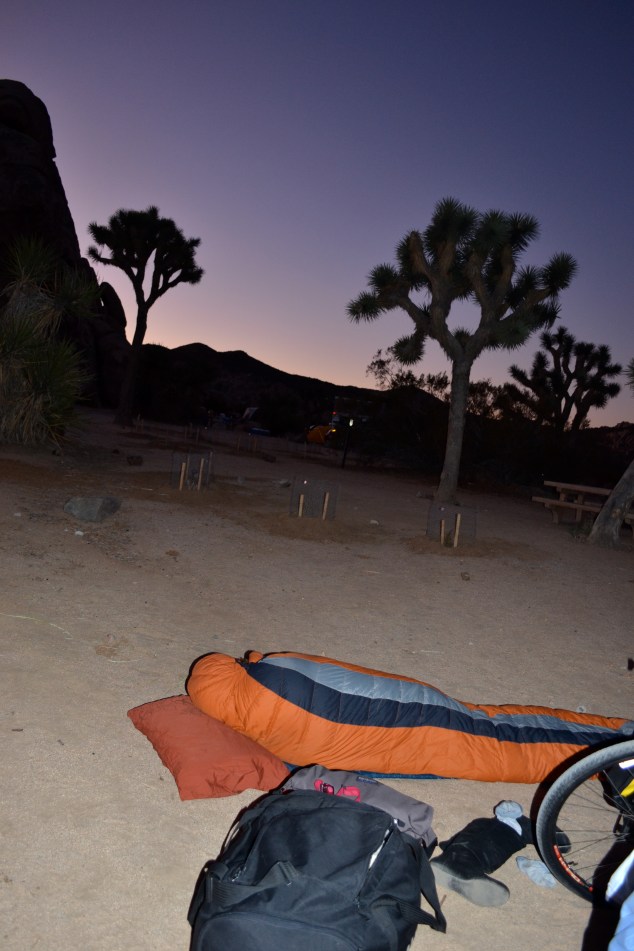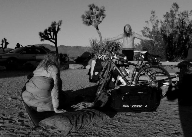 The goal was to meet in Joshua Tree and then head east across the desert to Phoenix where Brenna could catch a flight back to Oregon. We hadn’t done a ton of planning – the only details I gave them were a solid date to arrive and vague directions to a campsite. However, knowing that they were both extremely intelligent girls, I was confident that they would track me down and be ready to ride on the designated morning. Sure enough, I opened my tent the next day to a beautiful sunrise and the sight of Brenna, curled up next to my bike and trailer.